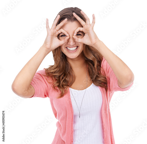 Portrait, smile and finger glasses with a woman isolated on a transparent background for vision. Playful, happy or funny with an attractive young female person posing for comedy or humor on PNG