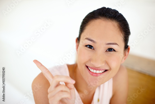 Portrait, smile and point with Asian woman at office for career direction, advertising and announcement of company. Happy, creative news and promotion, opportunity and information of offer alert