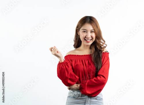 Portrait smile confident asian business designer woman red suit office. Asian business girl Startup successful power business leader women executive people, copy space isolated on white background.