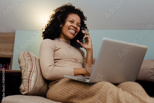 Portrait smiling african american businesswoman using laptop computer and talking with cellphone