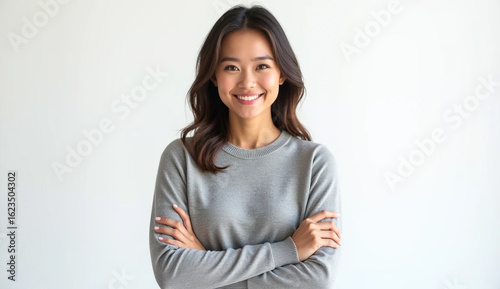 Portrait: Smiling woman on white. Studio lighting with a clean style. Works for portraits, posters, or branding.