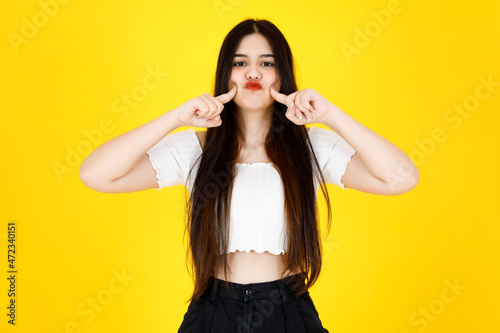 Portrait studio shot of Asian young beautiful sexy long black hair female model wearing crop top outfit standing and pose in joyful delight action on yellow background