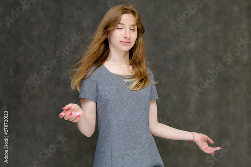 Portrait to the waist of a young pretty brunette girl woman with beautiful long hair on a gray background in a gray dress. He talks, smiles, shows his hands with emotions in various poses.