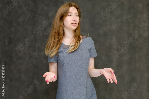 Portrait to the waist of a young pretty brunette girl woman with beautiful long hair on a gray background in a gray dress. He talks, smiles, shows his hands with emotions in various poses.