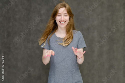 Portrait to the waist of a young pretty brunette girl woman with beautiful long hair on a gray background in a gray dress. He talks, smiles, shows his hands with emotions in various poses.