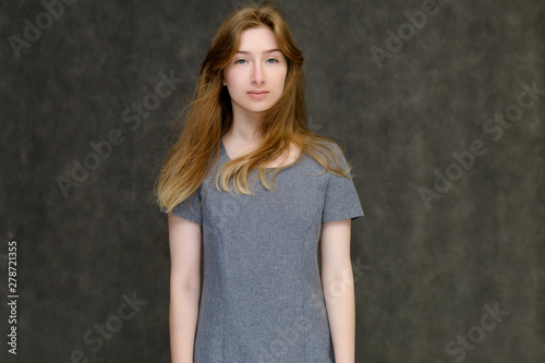 Portrait to the waist of a young pretty brunette girl woman with beautiful long hair on a gray background in a gray dress. He talks, smiles, shows his hands with emotions in various poses.