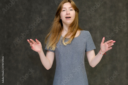 Portrait to the waist of a young pretty brunette girl woman with beautiful long hair on a gray background in a gray dress. He talks, smiles, shows his hands with emotions in various poses.
