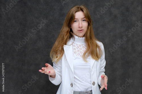 Portrait to the waist of a young pretty brunette girl woman with beautiful long hair on a gray background in a white jacket. He talks, smiles, shows his hands with emotions in various poses.