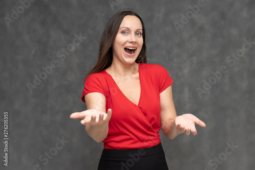 Portrait to the waist of a young pretty brunette woman of 30 years old in a bright red sweater with beautiful dark hair. It is standing on a gray background, talking, showing hands, with emotions