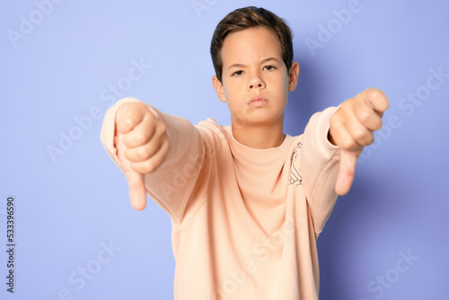 Portrait unhappy, angry, displeased child giving thumbs down hand gesture, isolated on purple background. Negative human face expressions, emotions, feelings, body language.