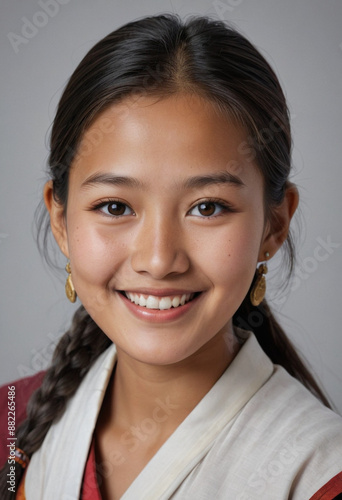 Portrait view of a regular happy smiling Bhutan girl, ultra realistic, candid, social media, avatar image, plain solid background
