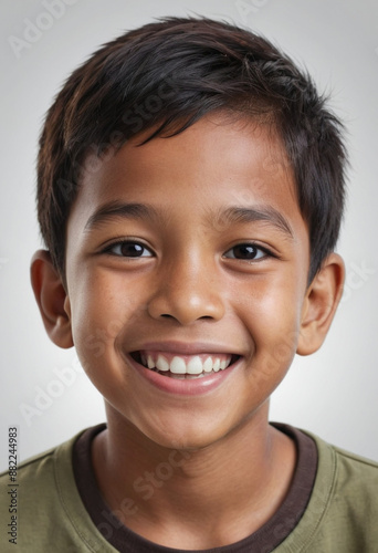 Portrait view of a regular happy smiling Indonesia boy, ultra realistic, candid, social media, avatar image, plain solid background