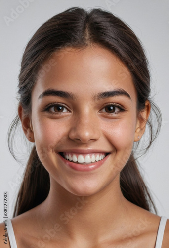 Portrait view of a regular happy smiling Venezuela girl, ultra realistic, candid, social media, avatar image, plain solid background