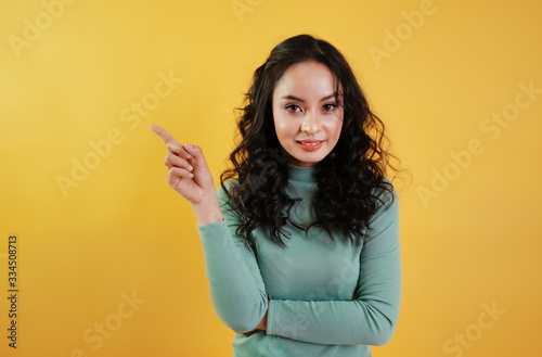 Portrait with copy space of charming, cute, nice, stylish and trendy woman in shirt with modern hairstyle, pointing forefinger on empty place, looking at camera, isolated on Yellow background.