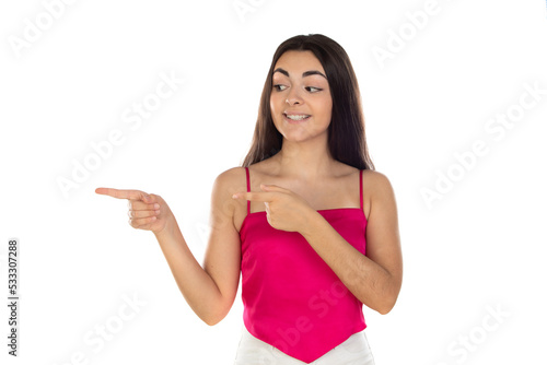 Portrait with copy space of charming, pretty, nice, stylish, brunette, trendy woman pointing forefinger on empty place