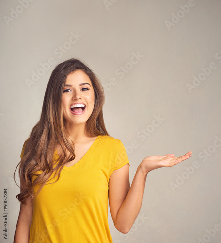 Portrait, woman and happy with presentation in studio for marketing, information or announcement. Female person, smile and hand with mockup space for promotion, news or advertising on gray background