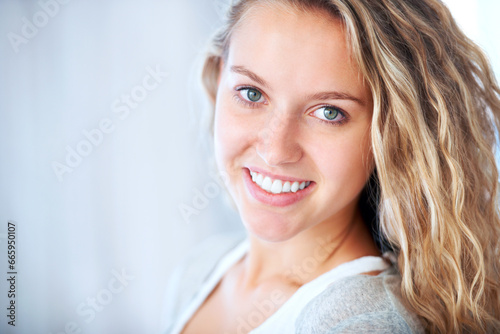 Portrait, woman and skincare with beauty, glow and natural for self care and wellness at home. Cosmetic, person and face with smile for glowing skin, facial treatment or shine with hair at house