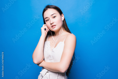 Portrait young asian woman listening music on phone with earphone isolated on blue background.