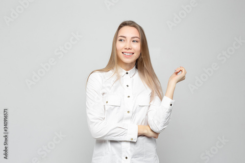 Portrait young beautiful smiling woman in white shirt isolated on white-gray background. Girl with minimal natural make-up on her face. The photo is not retouched with natural defects on the skin.