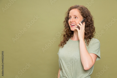 Portrait young redhead girl with curly hair smiling talking on the phone with green t-shirt on green background