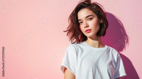 portrait young woman stay in white t shirt, fashion style, isolated on clean pastel background