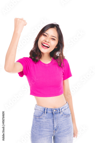 Portraits of young Asian women. Raise arms. With a smiling face happily, a beautiful woman with a sense of self-confidence, looks good, happy on a gray background.