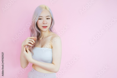 posing beautiful asia woman posing on pink background, emotions action, beauty concept