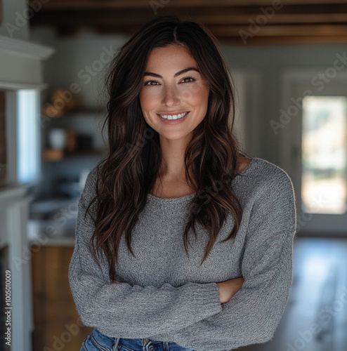 positive 35 year old brunette woman in an open layout home. she is nicely dressed in jeans and a solid sweater