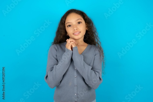 Positive Beautiful teen girl wearing blue jacket over blue background smiles happily, glad to receive pleasant news from interlocutor, keeps hands together. People emotions concept.