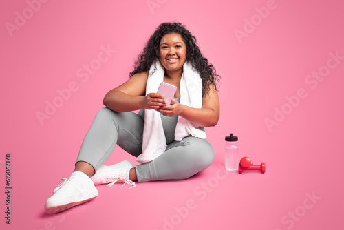 Positive black chubby woman relaxing with smartphone after workout, checking sports videos online