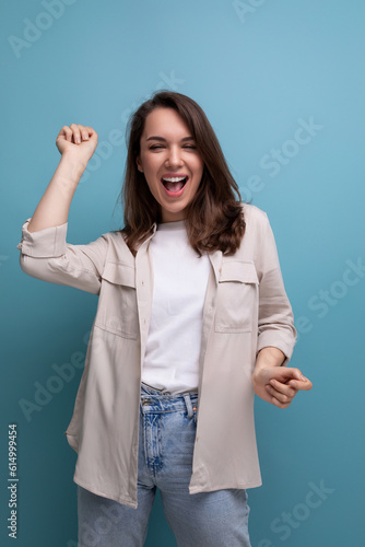 positive brunette young brunette lady dressed in a shirt and jeans shows with her hand that she has an idea