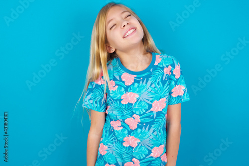 Positive Caucasian kid girl wearing hawaiian T-shirt against blue wall with overjoyed expression closes eyes and laughs shows white perfect teeth
