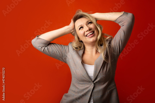 positive caucasian woman in suit on red background