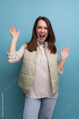 positive cheerful black-haired young lady in casual clothes over isolated background