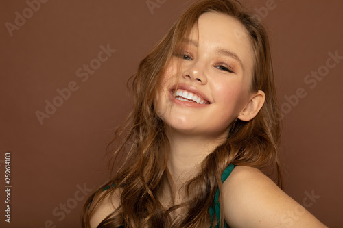 Positive, cheerful, funny, comic, fresh laughing natural nude girl with white teeth fresh cavity smooth soft skin laughing sincerely.