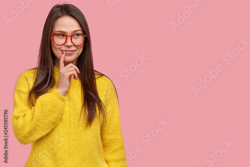 Positive female has pleasant smile, natural look, keeps finger near lips, concentrated aside, wears transparent glasses and loose sweater, isolated over pink background with copy space for your text
