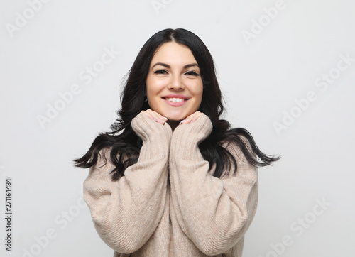 positive female with cheerful expression, dressed in casual clothes, over white background. Beautiful woman indoor.