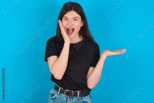 Positive glad young caucasian woman wearing black T-shirt over blue background says: wow how exciting it is, indicates something. One hand on his head and pointing with other hand.