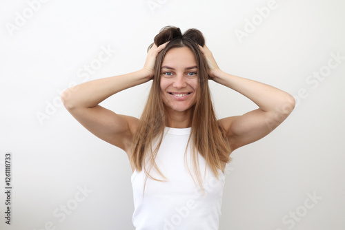 Positive happy relaxed young natural beauty woman with long straight hair holds hands head carefree smiling with teeth, looks at camera, wears white casual top isolated on background.