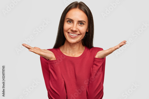 Positive hesitant cheerful young European tanned woman with long dark hair, raises palms in bewilderment, cant make decision between something pleasant, isolated over white background. So what?