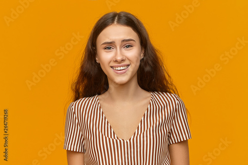 Positive human facial expressions, emotions and reaction. Adorable cute girl wearing striped summer dress expressing joy and full disbelief, receiving unbelievable news, smiling broadly at camera