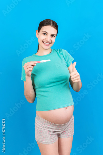 positive pregnancy test with two stripes against happy pregnant woman abdomen at Colored background. Future mother in gray dress. Pregnancy surprise. Copy space