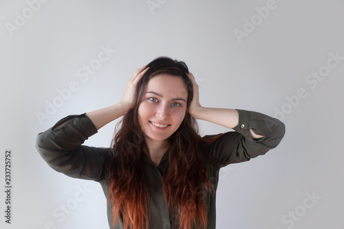 Positive pretty Caucasian girl holding head with both hands and smiling. Young female manager reacting to unexpected presents. Pleasant surprise concept