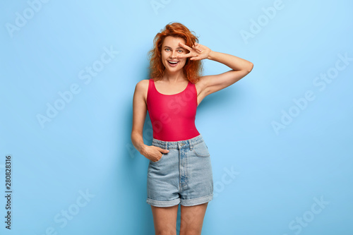Positive red haired young woman makes peace gesture, feels lucky, has fun, keeps one hand in pocket of denim shorts, grins at camera, expresses joyful attitude, models over blue wall. Body language