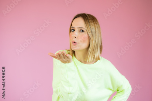 Positive romantic woman sending air kiss. Young woman in casual sweater standing isolated over pink background. Love or romance concept