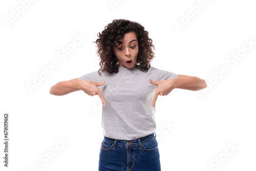 positive slim curly brunette promoter woman with glasses is dressed in a gray basic t-shirt with an identity print mockup on a white background with copy space
