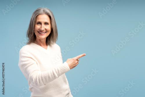 Positive, smiling gray haired senior woman looking at camera, pointing finger on copy space, showing