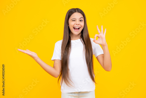 Positive teenager child points aside with cheerful expression, shows amazing at blank empty space. Advertisement and mockup. Excited teenager, glad amazed and overjoyed emotions.