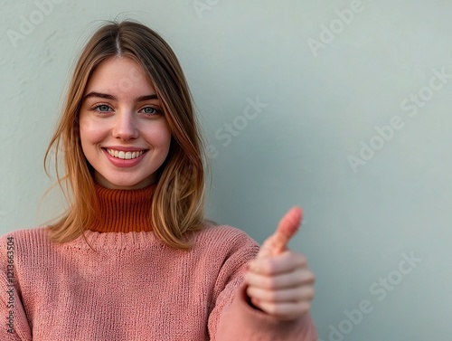 Positive vibes young woman giving thumbs up urban setting portrait photography bright background