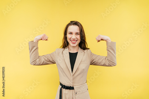 Positive woman in a beige suit shows biceps and looks at the camera with a smile on her face, isolated on a yellow background. Female power.